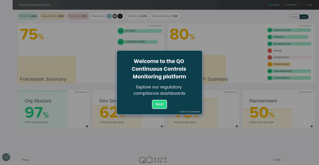Explore our guided demo to see how the Quod Orbis CCM platform empowers your organisation to stay fully compliant with regulatory requirements. Experience first-hand how it connects to any data source, monitors every control, and aligns seamlessly with any compliance framework, giving you complete visibility and confidence in your regulatory posture.