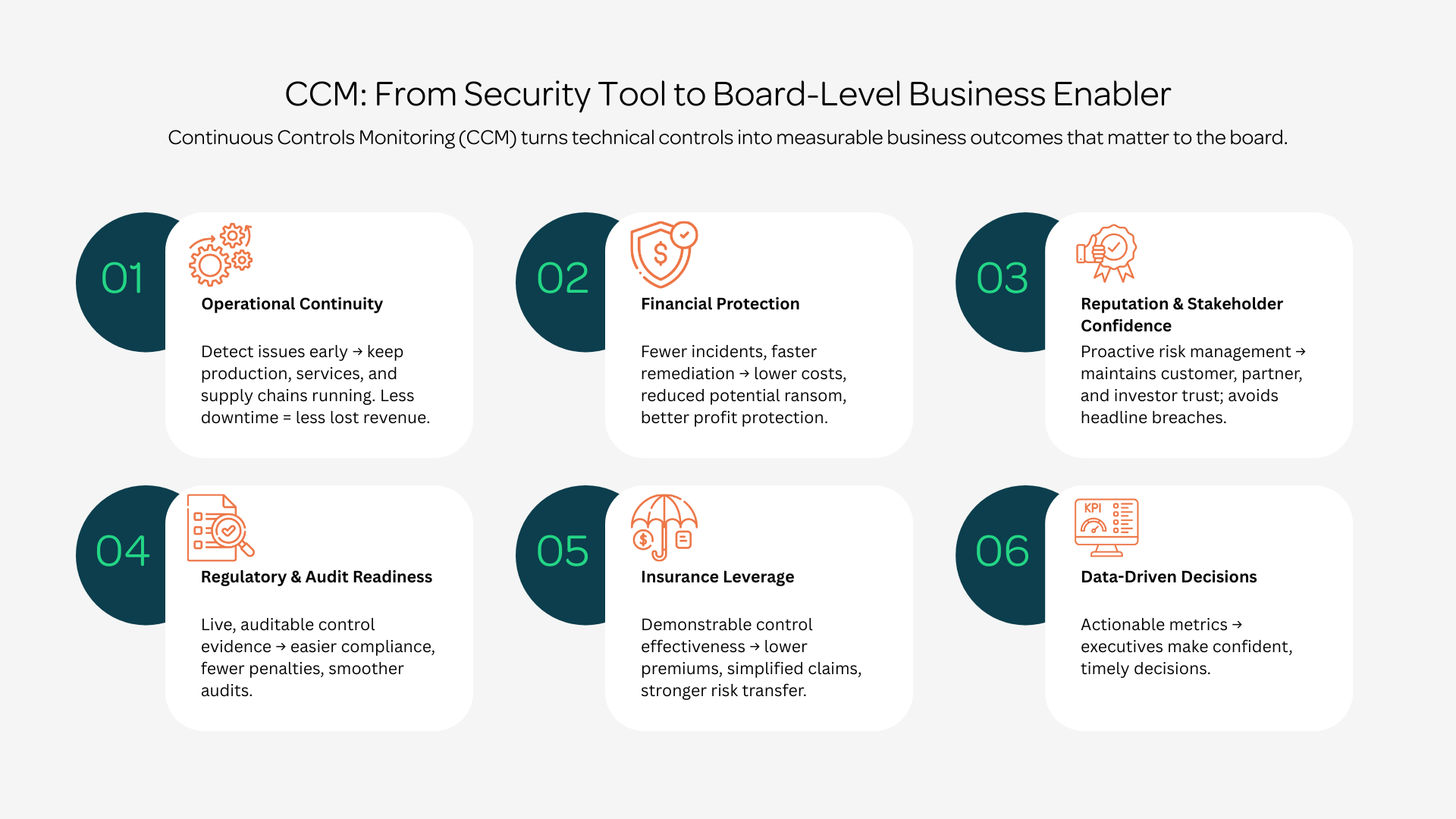 Continuous Controls Monitoring isn’t just a security tool – it’s a business enabler. Here’s what it delivers in concrete, board-relevant terms: